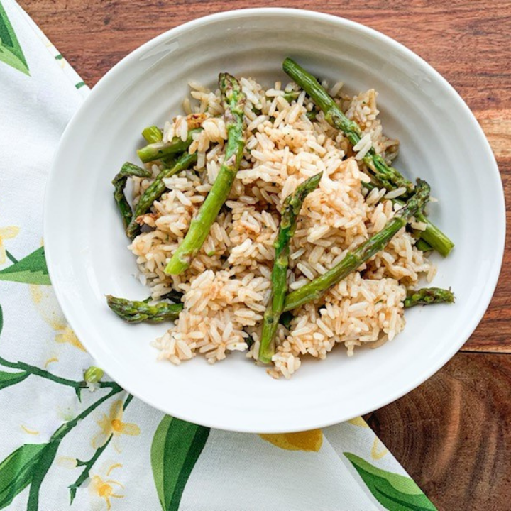 Garlic butter and asparagus make an unlikely duo in this delicious rice bowl. Fresh and springy, it will have you asking for seconds!